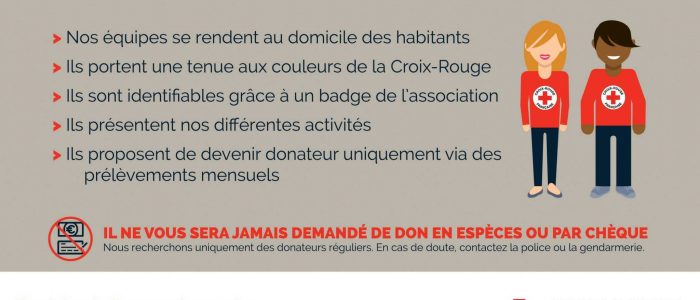 Prochainement et pendant plusieurs jours, des équipes formées et averties se rendront au domicile des habitants. Elles seront parfaitement identifiables grâce à un badge et une tenue aux couleurs de la Croix-Rouge française. Elles seront présentes sur le terrain, entre le 12 Novembre 2025 et le 29 Novembre 2025 , en journée jusqu'à 21h00 maximum.